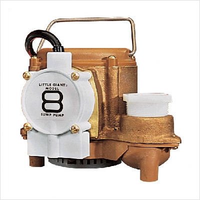 Little Giant 8-CBA, 4/10 HP, 45 GPM - Automatic Submersible Sump Pump, 10' power cord (508357)Big John Submersible Sump Pumps - 8 SeriesThe Big John submersible sump pumps provide efficient; trouble-free service for extended or continuous use in moving large volumes of water. Little Giant's submersible sump pumps are ideal for use in Excavation; Crawl Space; Basement; Underground Passageway; Loading Docks; Grain Elevator; Construction Site; Cooling Tower; Fire Cleanup and other applications requiring high volume water dispersal.Little Giant 8-CBA, 4/10 HP, 45 GPM - Automatic Submersible Sump Pump, 10' power cord (508357) Features:; Cast bronze pump housings for corrosion and rust resistance.; Oil filled motor housing for lifetime lubrication and rapid heat dissipation.; Stainless steel screws, bolts, and handle.; Mechanical seals (stainless steel spring, nitrile parts, carbon and ceramic faces).; Thermal overload protection.; Automatic operation with pressure switch operates when water level is between 7" to 10". Pump shuts off when water level falls to between 1" - 4" (Pressure switch is non-adjustable). ; 1-1/2 FNPT dischargeLittle Giant 8-CBA, 4/10 HP, 45 GPM - Automatic Submersible Sump Pump, 10' power cord (508357) Specifications:; Horsepower 4/10; Flow 3250 GPH @ 5' of Head; Cord Length 10'; Shut Off 22.9'; Voltage 115; Hertz 50/60; Amps 10; Watts 830; Weight 21.25 lbs.; Height 6"; Width 8.5"; Length 9.5"See Customer Reviews
